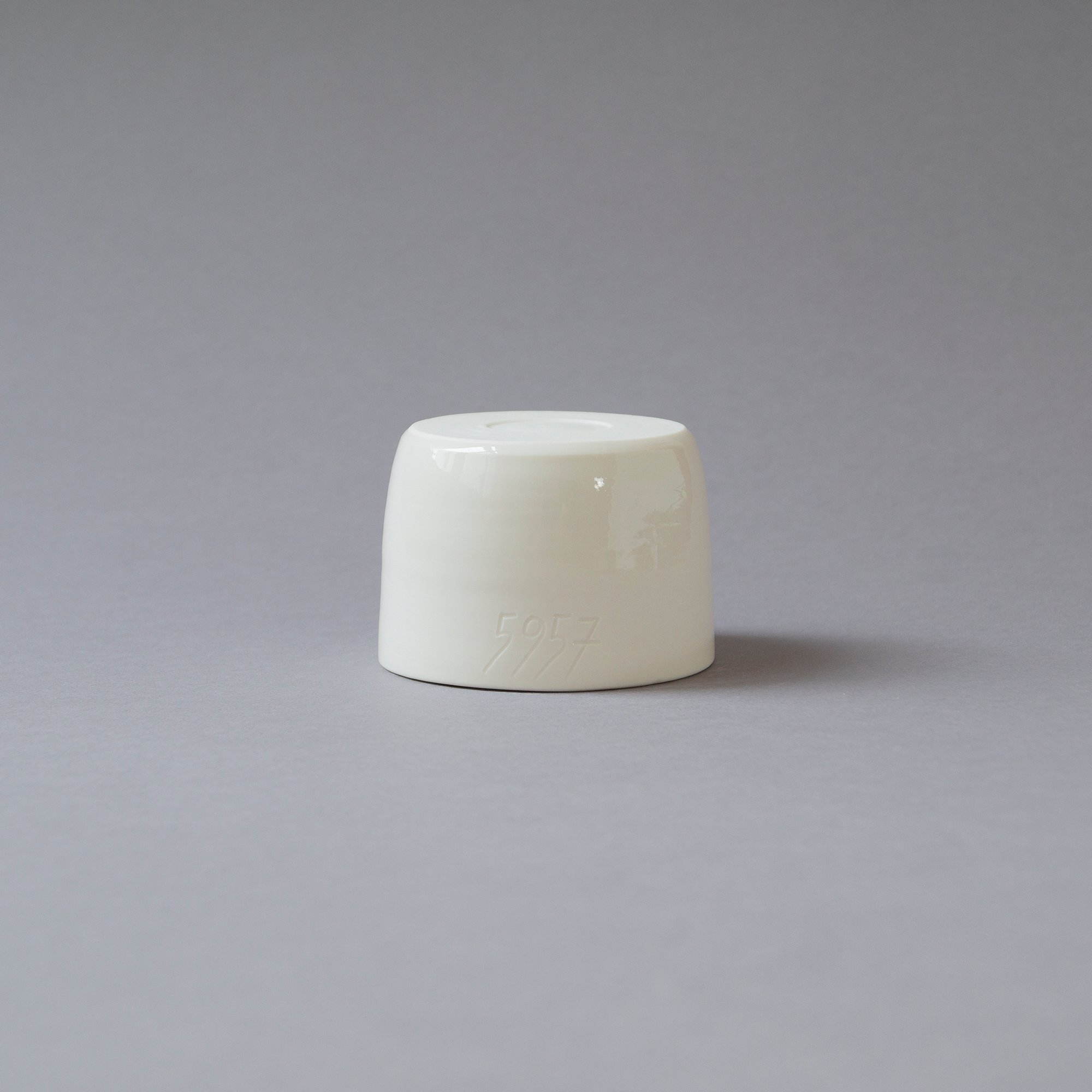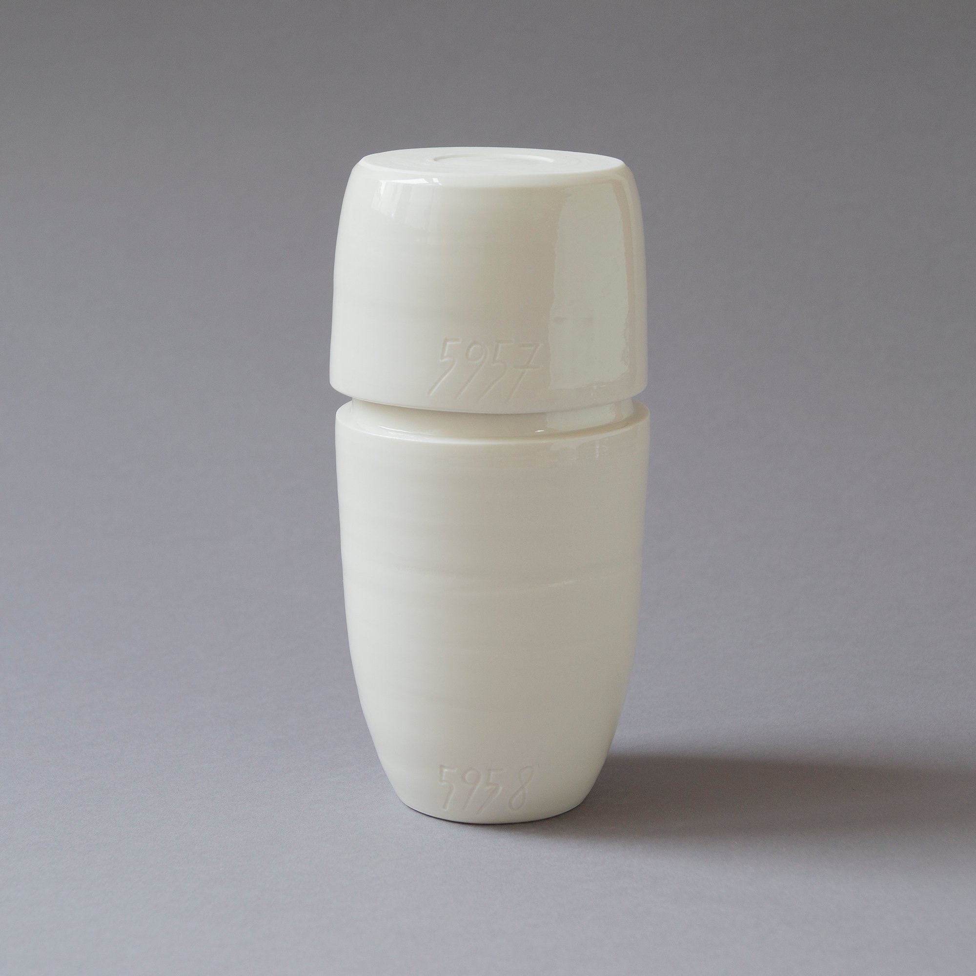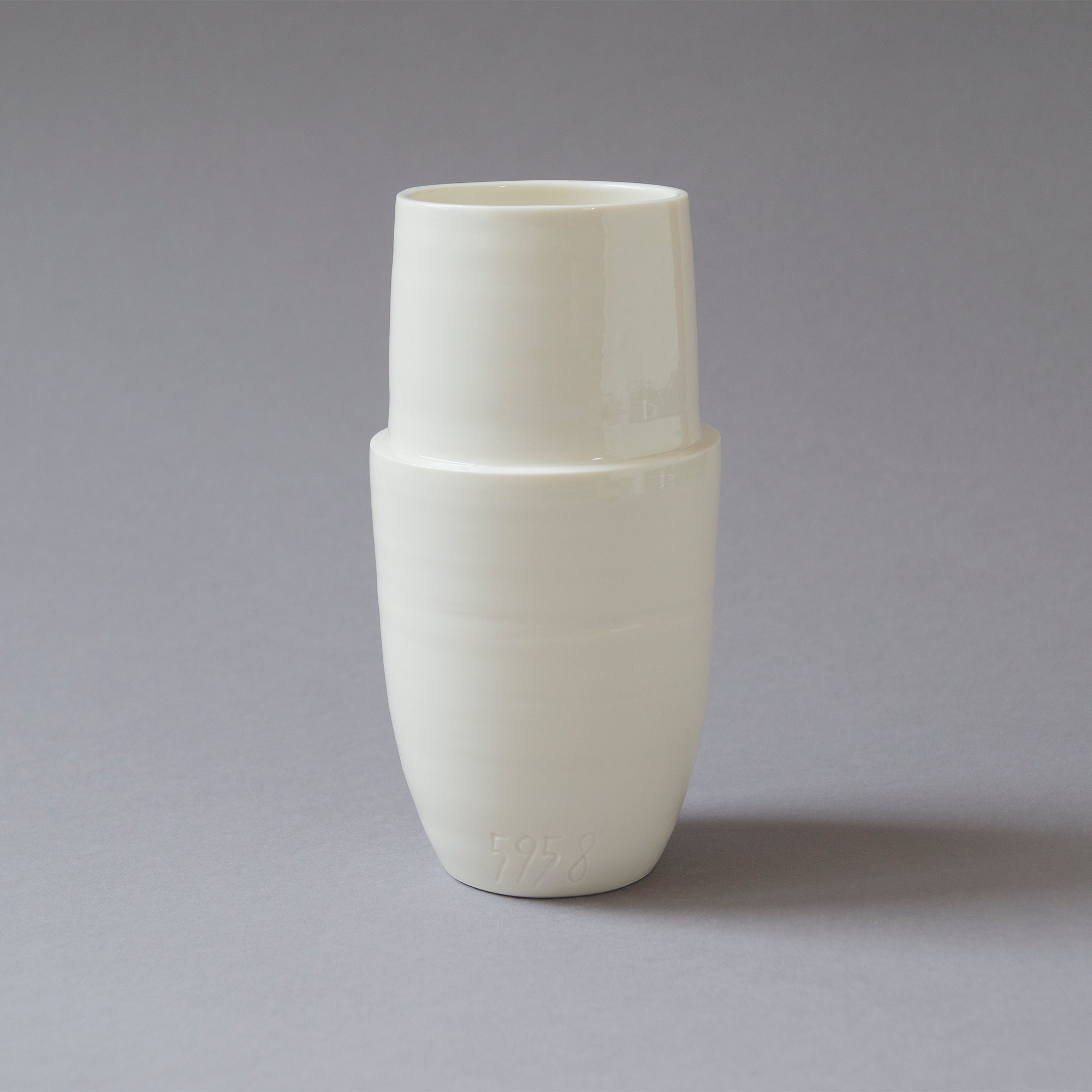 Freigedrehte Flasche mit Becher aus Limoges Porzellan mit eingravierter fortlaufender Nummer. Dadurch wird Ihr Porzellanbecher zu einem einzigartigen Unikat. Transparent glasiert. Bleifrei. Bei 1300 Grad Celsius gebrannt. Robust und geschirrspültauglich.