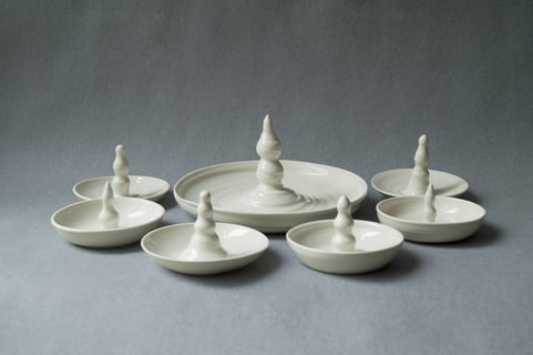 7 freigedrehte Porzellanstücke mit eingravierten fortlaufenden Nummern. Dadurch wird jedes einzelne Porzellan zu einem Unikat. Transparent glasiert. Bleifrei. Bei 1300 Grad Celsius gebrannt. Robust und geschirrspültauglich.